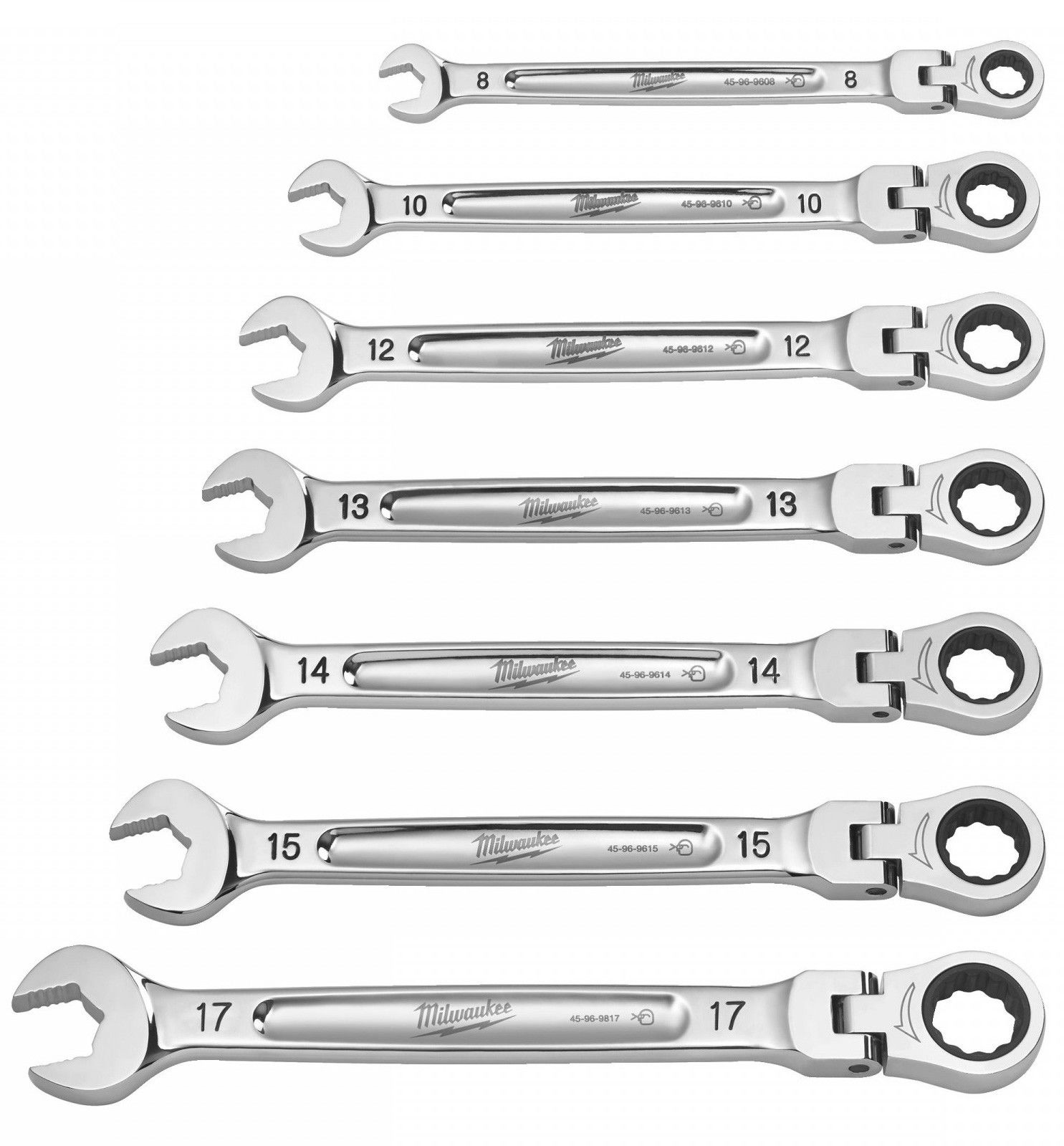 Milwaukee MAX BITE™ csuklós fejű racsnis csillag-villáskulcs készlet, metrikus, 7 darabos